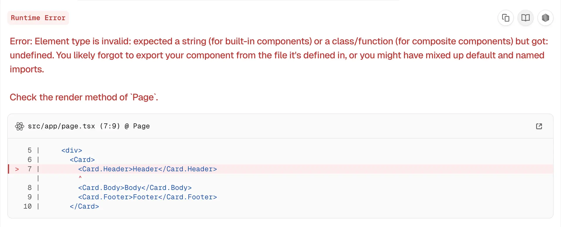 에러 로그에 따르면, 서버는 Card.Header가 문자열, 클래스, 함수 중 하나라고 예상했지만 실제로는 undefined를 전달받았다고 합니다. 분명 코드에서 Header를 Card의 속성으로 지정해 두었는데, 존재하지 않는 것처럼 인식되는 것입니다.